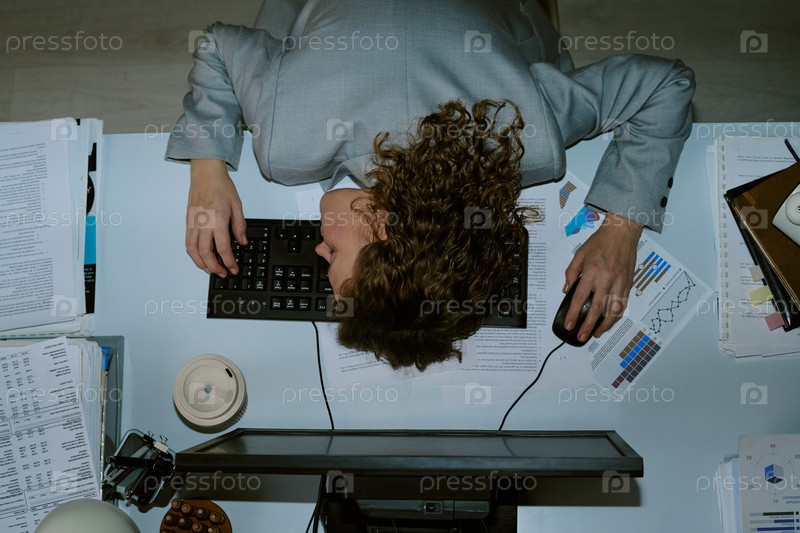 Молодая женщина отдыхает головой на столе, работая в офисе