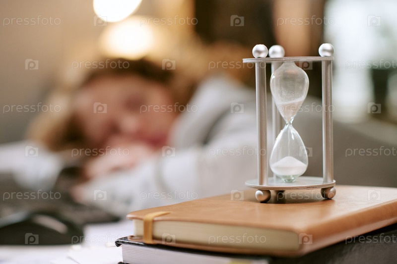 Молодая взрослая женщина спит за рабочим столом с песочными часами на переднем плане