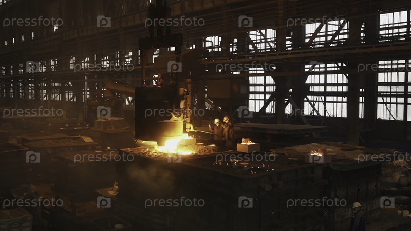 Расплавленный металл наливается в форму на сталелитейной фабрике