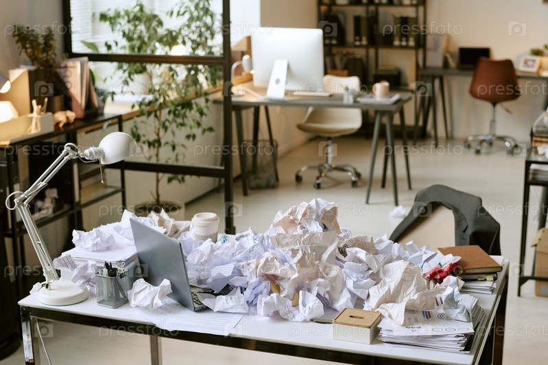 Беспорядочный офисный стол с скованными бумагами, окружающими ноутбук во время рабочего дня