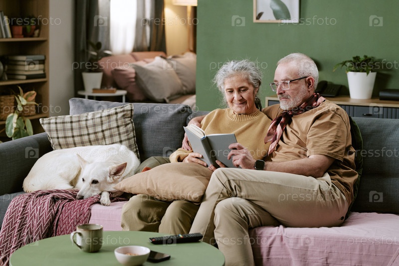 Старшая белая пара читает книгу вместе, сидя на диване дома