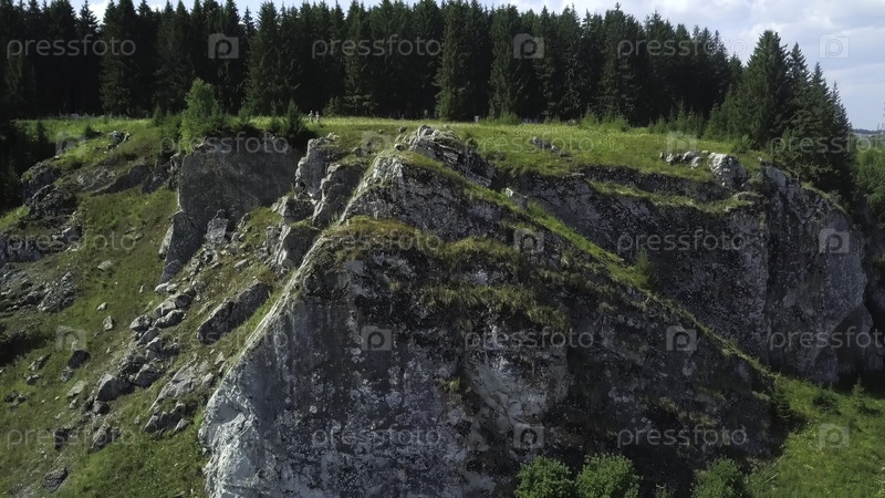Вид с воздуха показывает прочное скальное образование, окруженное яркой зеленью и высокими деревьями в живописном пейзаже