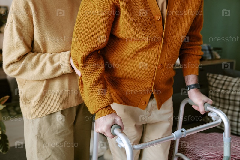 Старший кавказский мужчина с помощью ходунка, которому помогает женщина среднего возраста