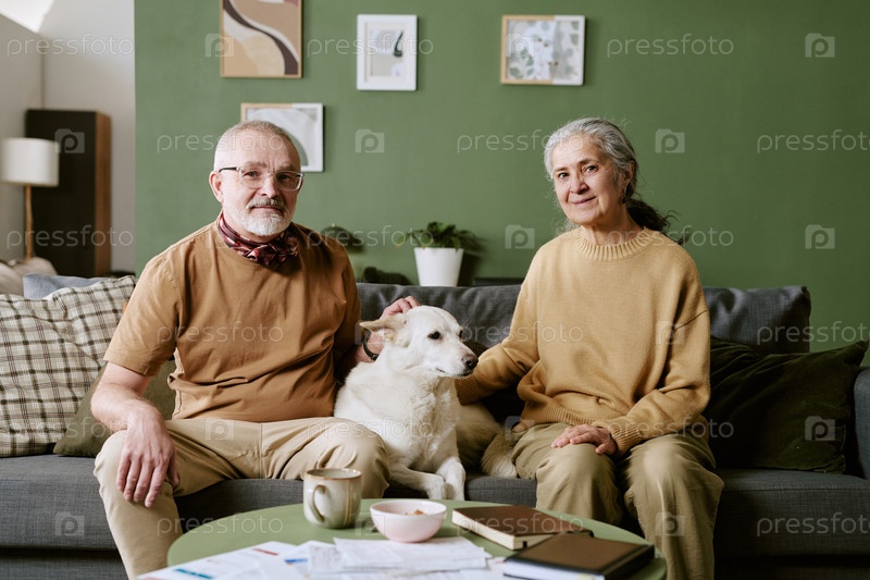 Кавказский мужчина и старшая кавказская женщина сидят с собакой в помещении