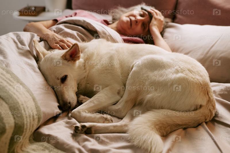 Старшая кавказская женщина отдыхает в постели, а собака спит рядом с ней