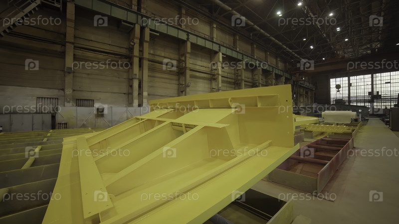 Большая желтая металлическая структура, вращающаяся в промышленной мастерской