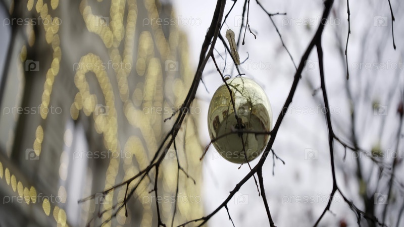 Золотой рождественский шар висит на обнаженной ветке