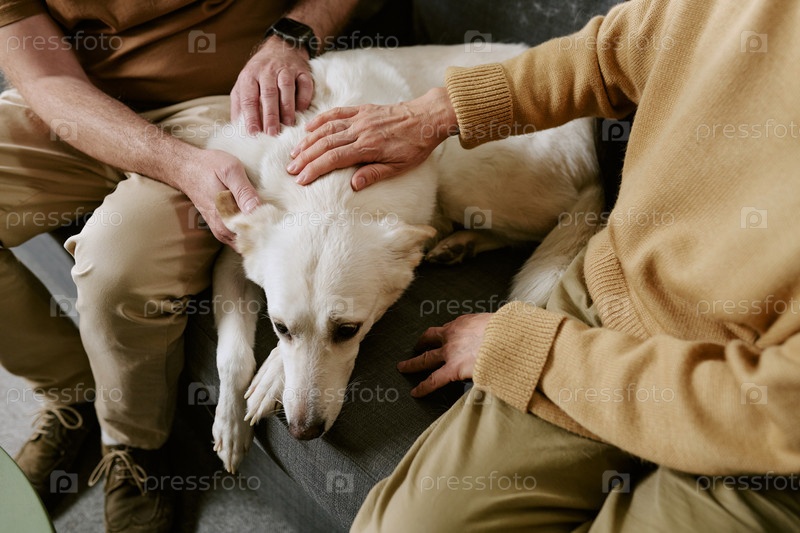 Старшая пара ласкает расслабленную собаку, сидя в помещении