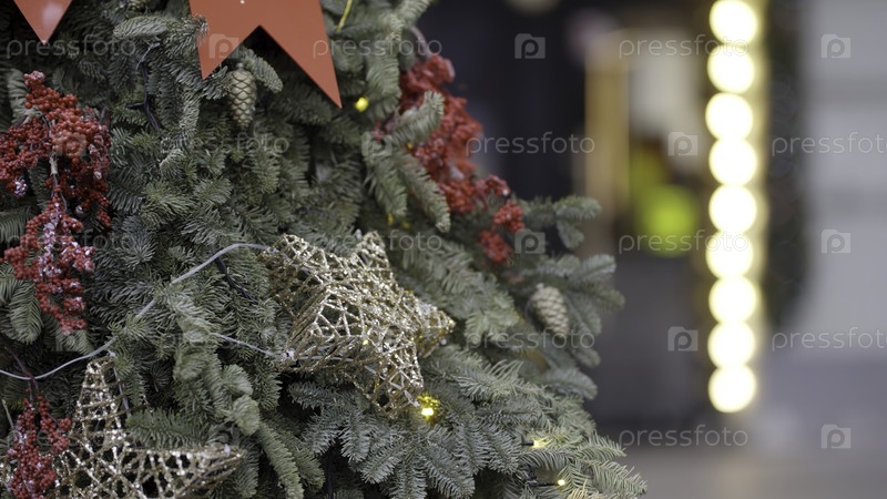 Рождественская елка украшена золотыми звездами и красными орнаментами