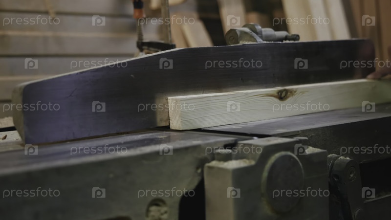 Кормление древесины через прядильное лезвие, точное деревообработка в теплых условиях освещения мастерской . СМИ