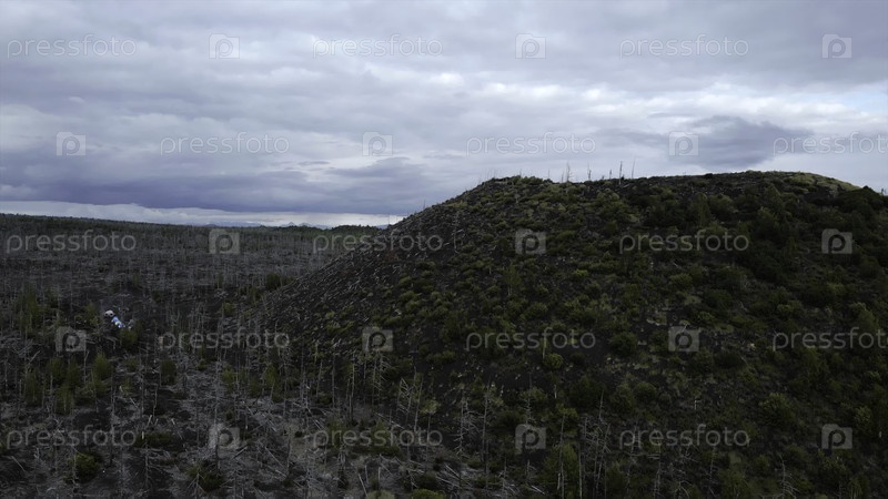 Вулканический ландшафт с мертвым лесом и кемпинговыми палатками