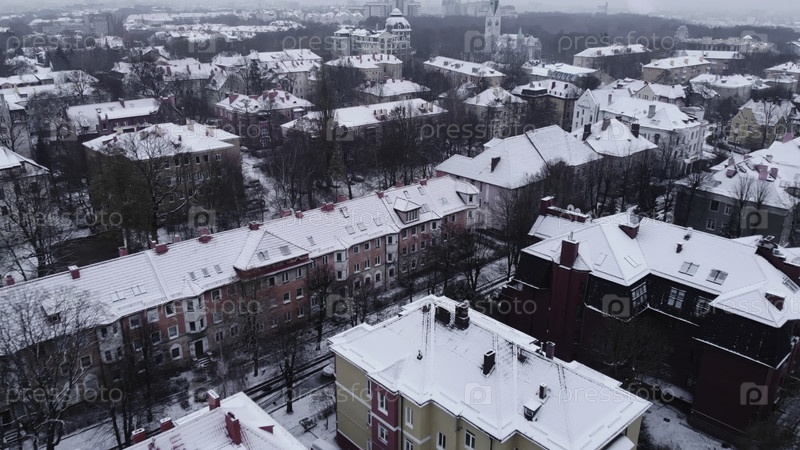 Воздушный дрон летает над снежными европейскими городскими крышами