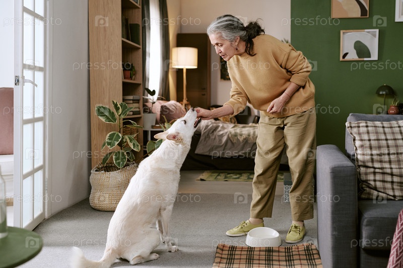 Кавказская женщина кормит большую собаку в помещении днем Senior Caucasian Woman Feeding Large Dog Indoors during Daytime