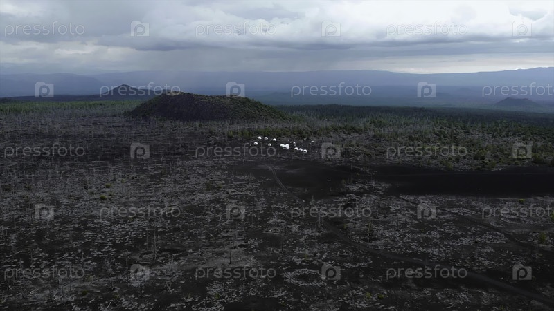 Вид с воздуха палаток для глампинга в вулканическом ландшафте
