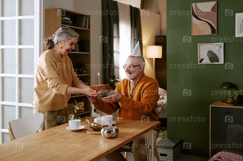 Старшая белая женщина дарит торт на день рождения старшему мужчине-белому с улыбкой
