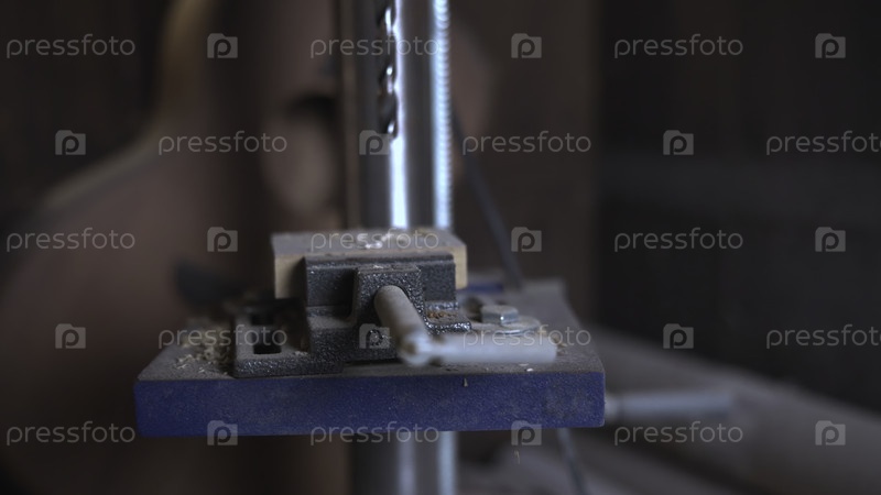 Сверловой пресс вращается и делает отверстие в дереве.СМИ