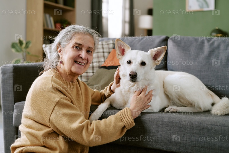 Портрет старшей белокожей женщины, улыбающейся во время того, как она ласкает собаку на диване