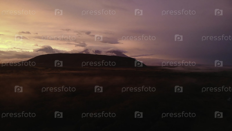 Розовые закатные облака над вулканическим горным пейзажем