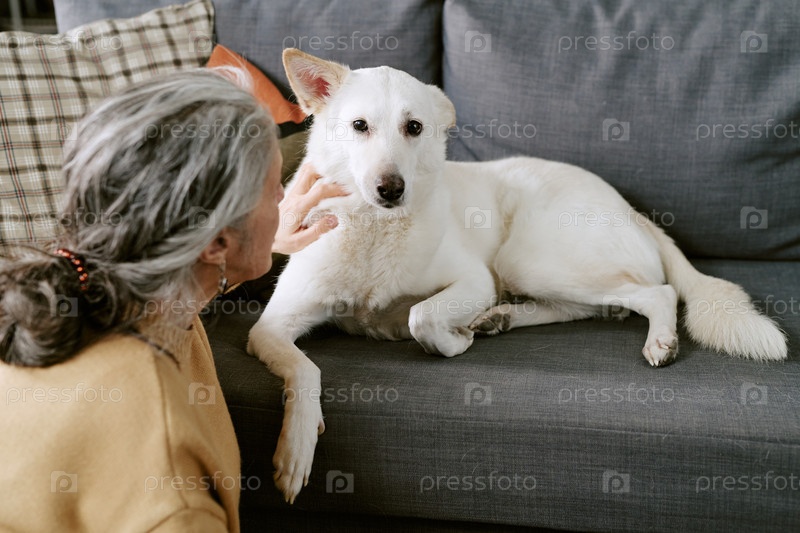 Кавказская женщина Senior Petting Dog Расслабляясь на диване в помещении