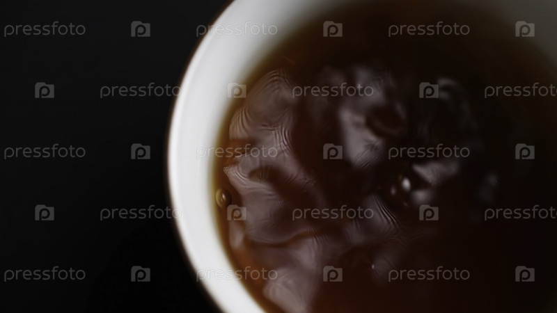 Ближайший снимок золотого сиропа, который элегантно заливается в гладкую, нетронутую белую чашу, создавая соблазнительный вихрь