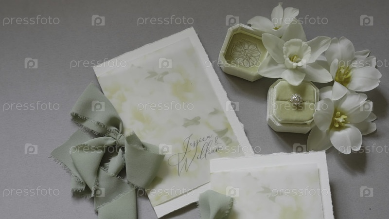 Элегантные свадебные канцелярские принадлежности с белыми тюльпанами и бриллиантовым кольцом