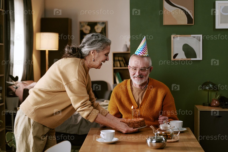 Кавказский мужчина улыбается, получая пирог от старшей женщины