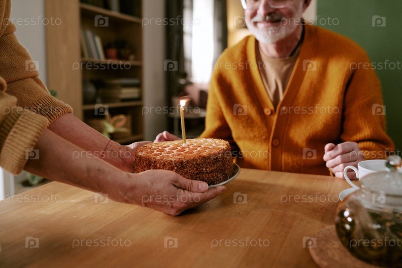 Старший кавказский мужчина улыбается, получая пирог с свечой