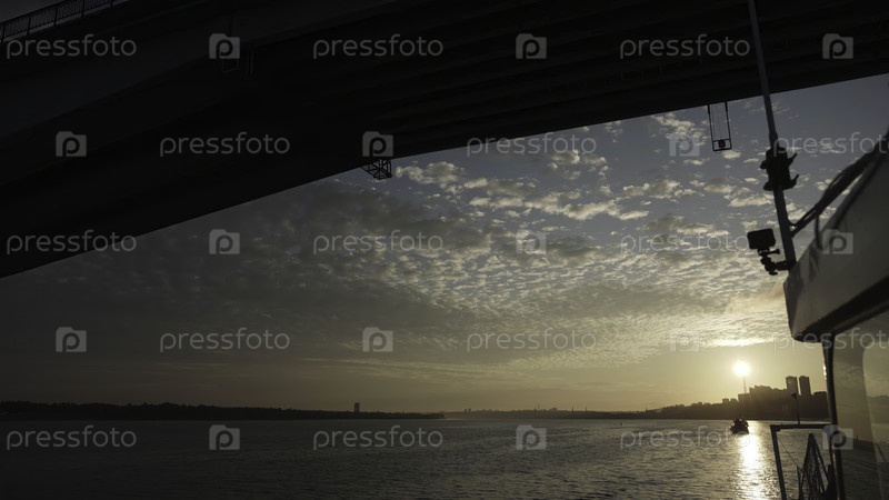 Корабль, проходящий под мостом при закате солнца с облаками