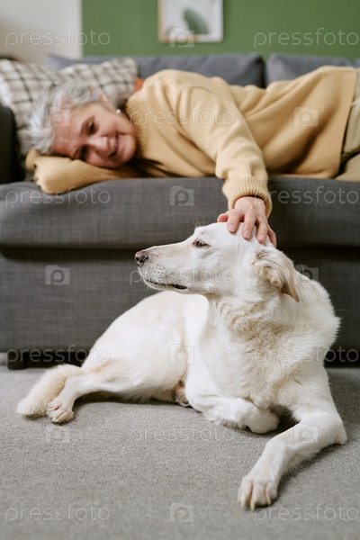 Старшая кавказская женщина отдыхает на диване, лаская собаку в гостиной