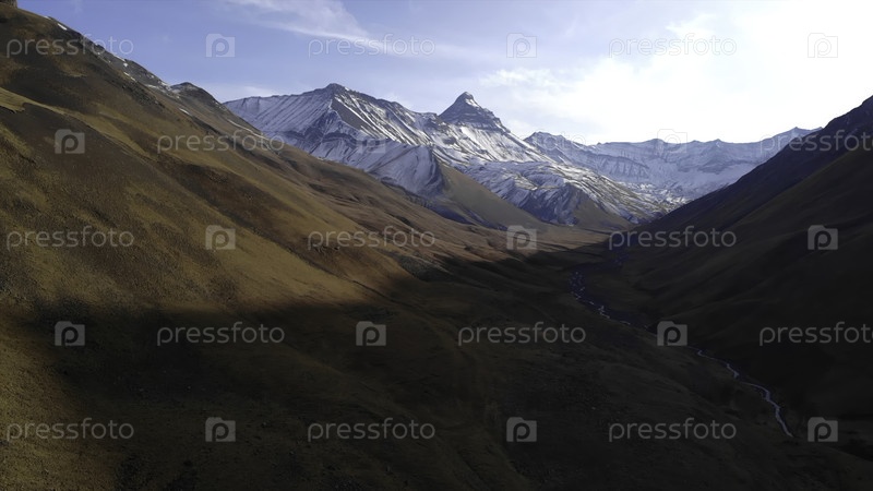 Сцена восхода солнца над заснеженной горной долиной, замороженные вершины светятся, когда утром через долину дует поток