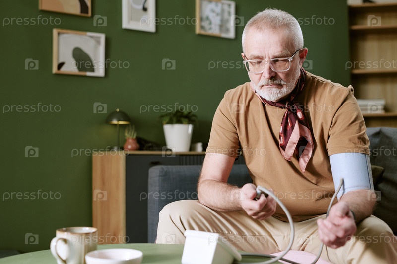 Старший белый мужчина измеряет кровяное давление дома в гостиной