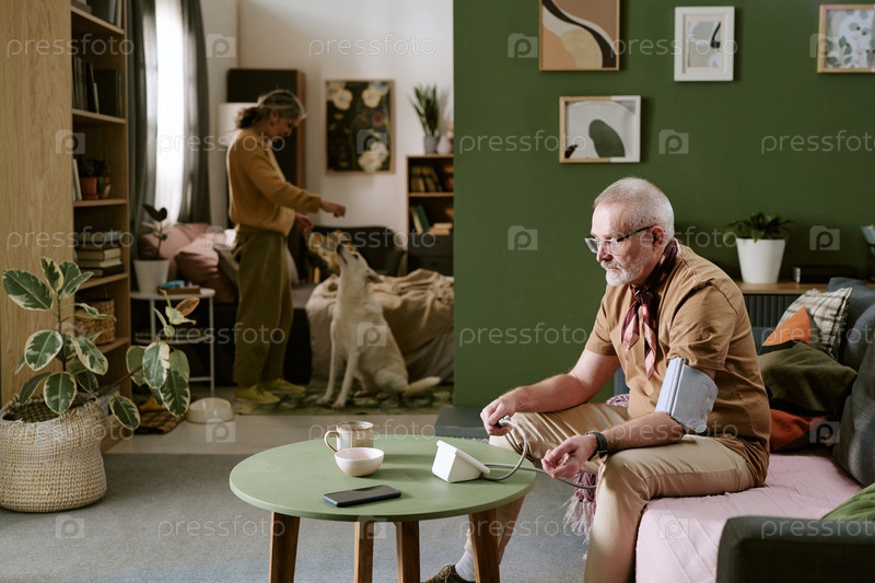 Старший белый мужчина измеряет кровяное давление, сидя в гостиной