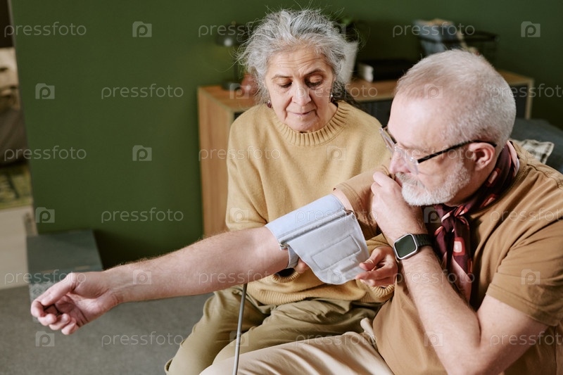 Белый мужчина измеряет кровяное давление со старшей белокожей женщиной, помогающей