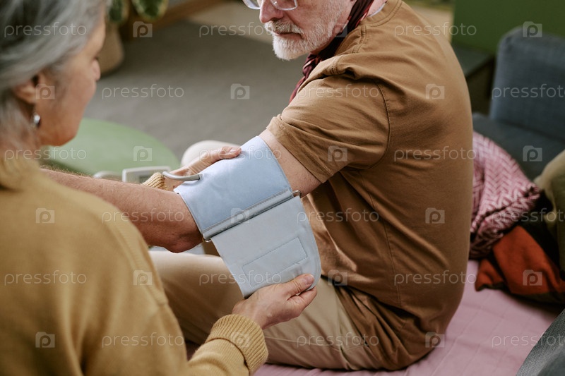 Кавказский мужчина с высоким кровяным давлением проверяется женщиной