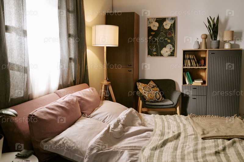 Уютный современный интерьер спальни с солнечным светом, идущим через окно