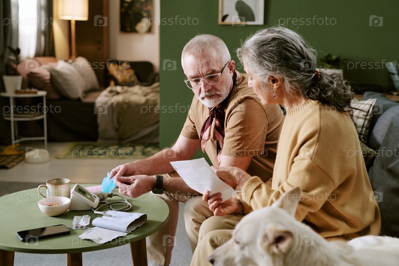 Старшая белая пара просматривает медицинский рецепт, сидя в помещении