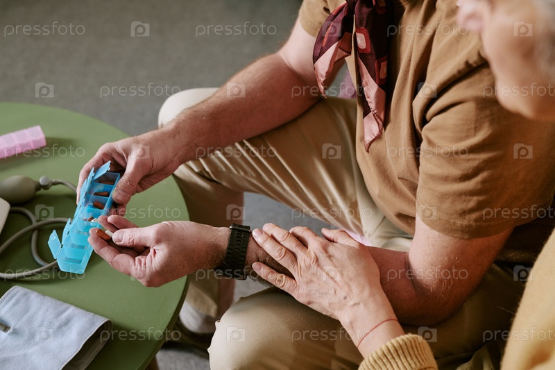 Старший белый мужчина принимает лекарства при поддержке старшей жены