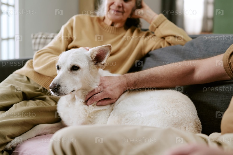 Кавказская женщина и мужчина ласкают собаку на диване в гостиной Senior