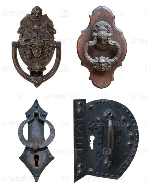 Набор макетов: Старый дверной замок и ручка изолированы на белом фоне