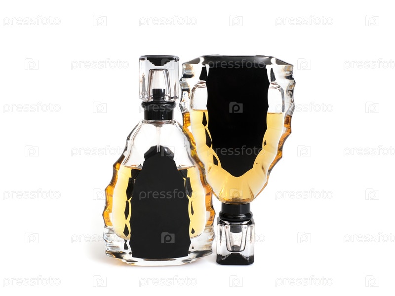 Бутылка парфюмерии с черной маркировкой, изолированная на белом фоне, готовая к вырезу