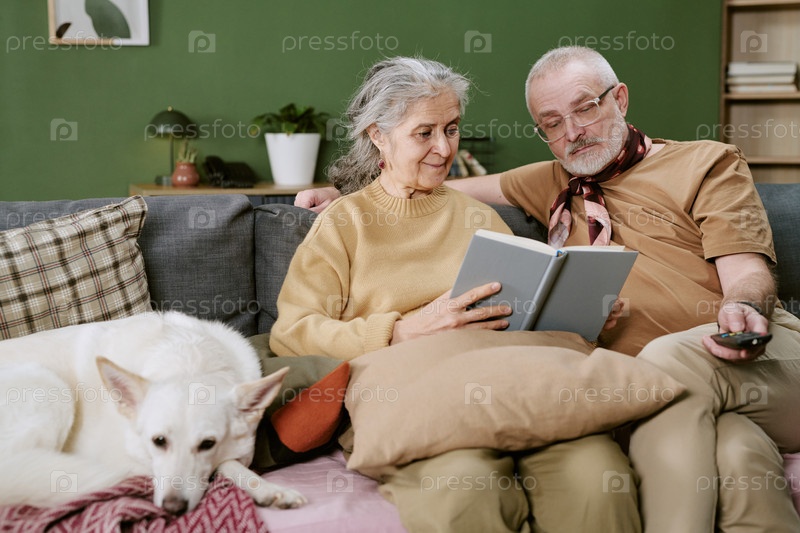Старшая белая пара, сидящая на диване и читающая книгу вместе дома