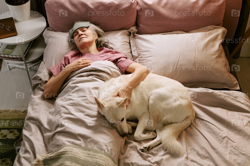 Старшая белая женщина отдыхает в постели с собакой, лежащей рядом со своим спящим