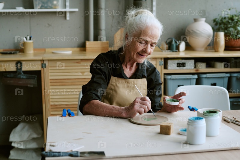 Старшая женщина рисует керамическую плиту, улыбаясь в художественной студии