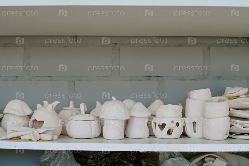 Ручно изготовленные керамические грибы и чашки сушат на полке в посудомоечной мастерской