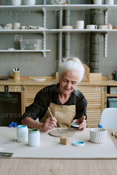 Старшая женщина рисует керамическую плиту в гончарной мастерской
