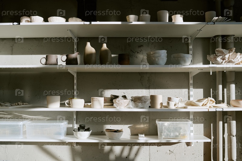 Керамические миски и вазы расположены на полках в солнечной студии керамики