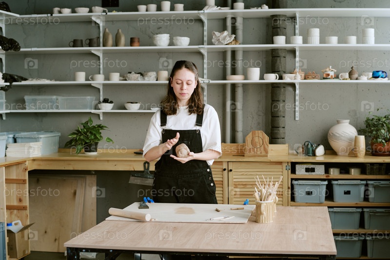 Молодая взрослая женщина формирует глину, работая в студии керамики