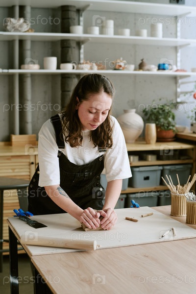 Молодая взрослая женщина формирует глину, работая в креативной студии