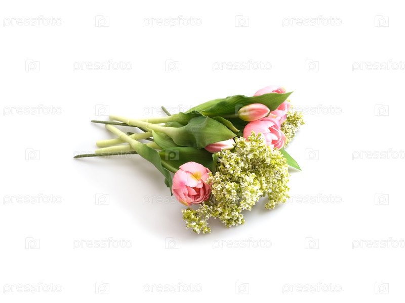 Букет розовых тюльпанов и зеленых листьев, изолированных на белом фоне