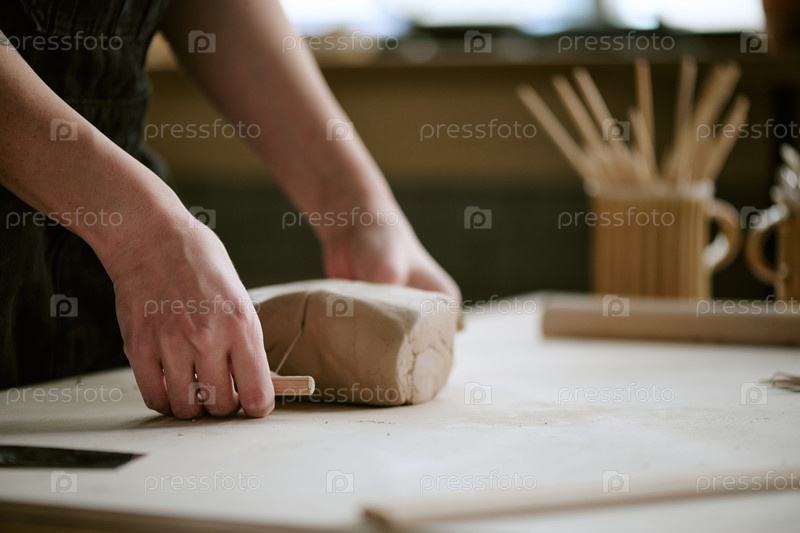 Женщина, формирующая глину с помощью деревянного инструмента в керамической студии